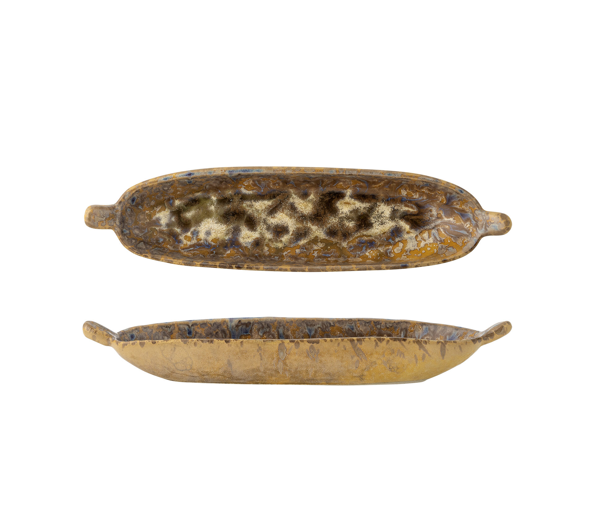 Cette jolie assiette service est un petit plateau long dans les tons bruns avec une glaçure réactive qui crée un jeu de couleur naturel.