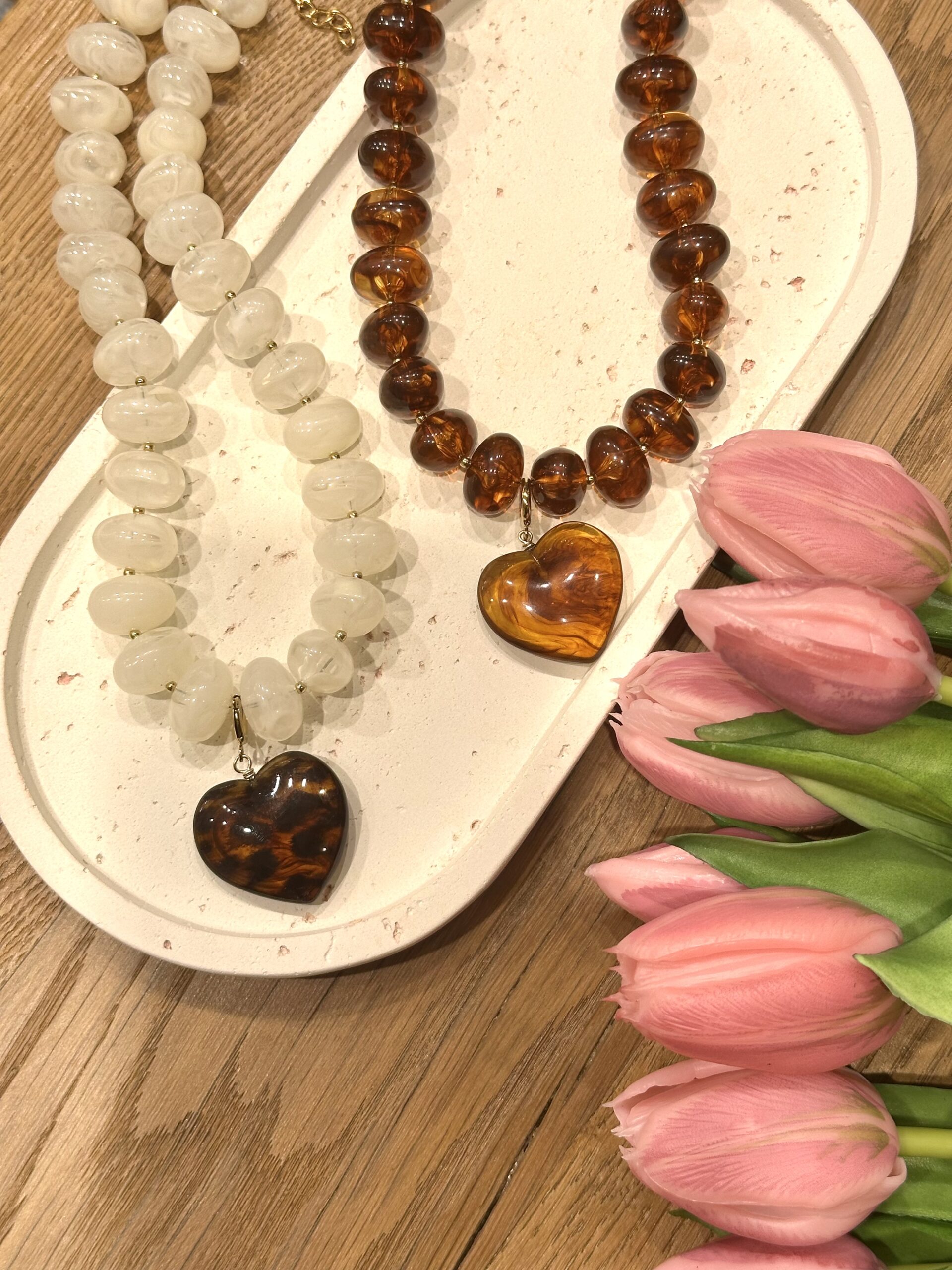 Un joli collier sur cordon composé de grosses perles en résine colorée et d’un pendentif amovible en forme de coeur.