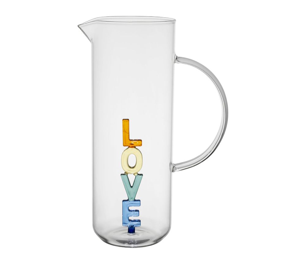Ajoutez une touche de fantaisie et de bonne humeur à votre table avec le pichet LOVE coloré. À la fois pratique et décoratif, il séduit par son design épuré en verre transparent et son inscription LOVE en lettres colorées intégrées, pour un style joyeux et contemporain.