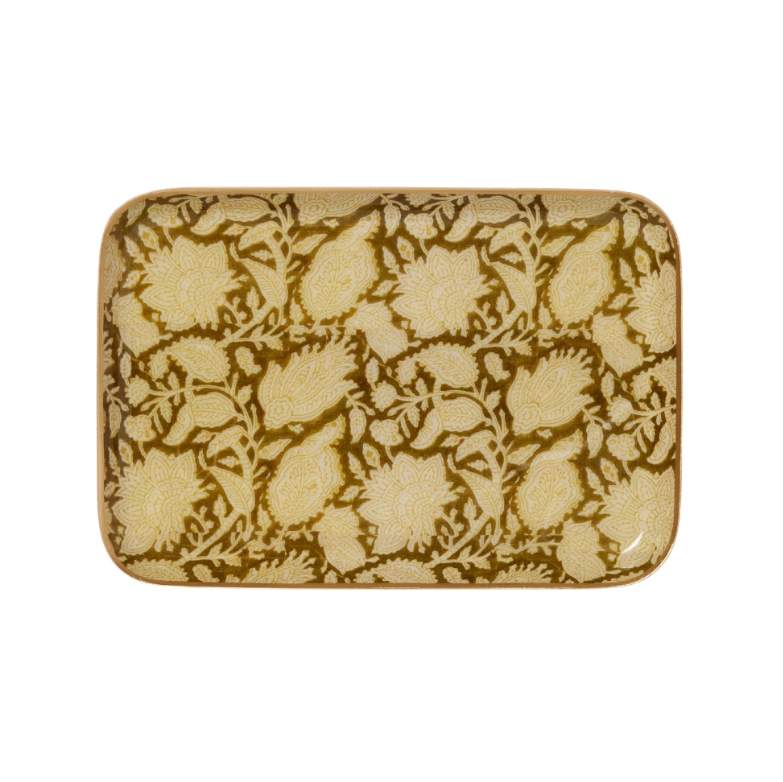 Le plateau est en métal émaillé avec une bordure dorée à la main. C’est une pièce unique, façonnée des mains des artisans Indiens ce qui lui confère des irrégularités.