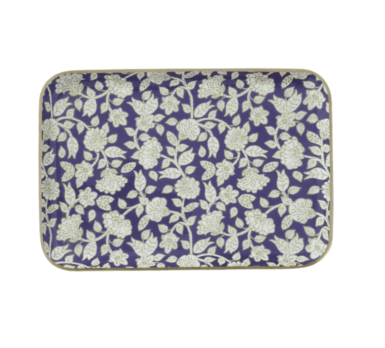 Le plateau est en métal émaillé avec une bordure dorée à la main. C’est une pièce unique, façonnée des mains des artisans Indiens ce qui lui confère des irrégularités.