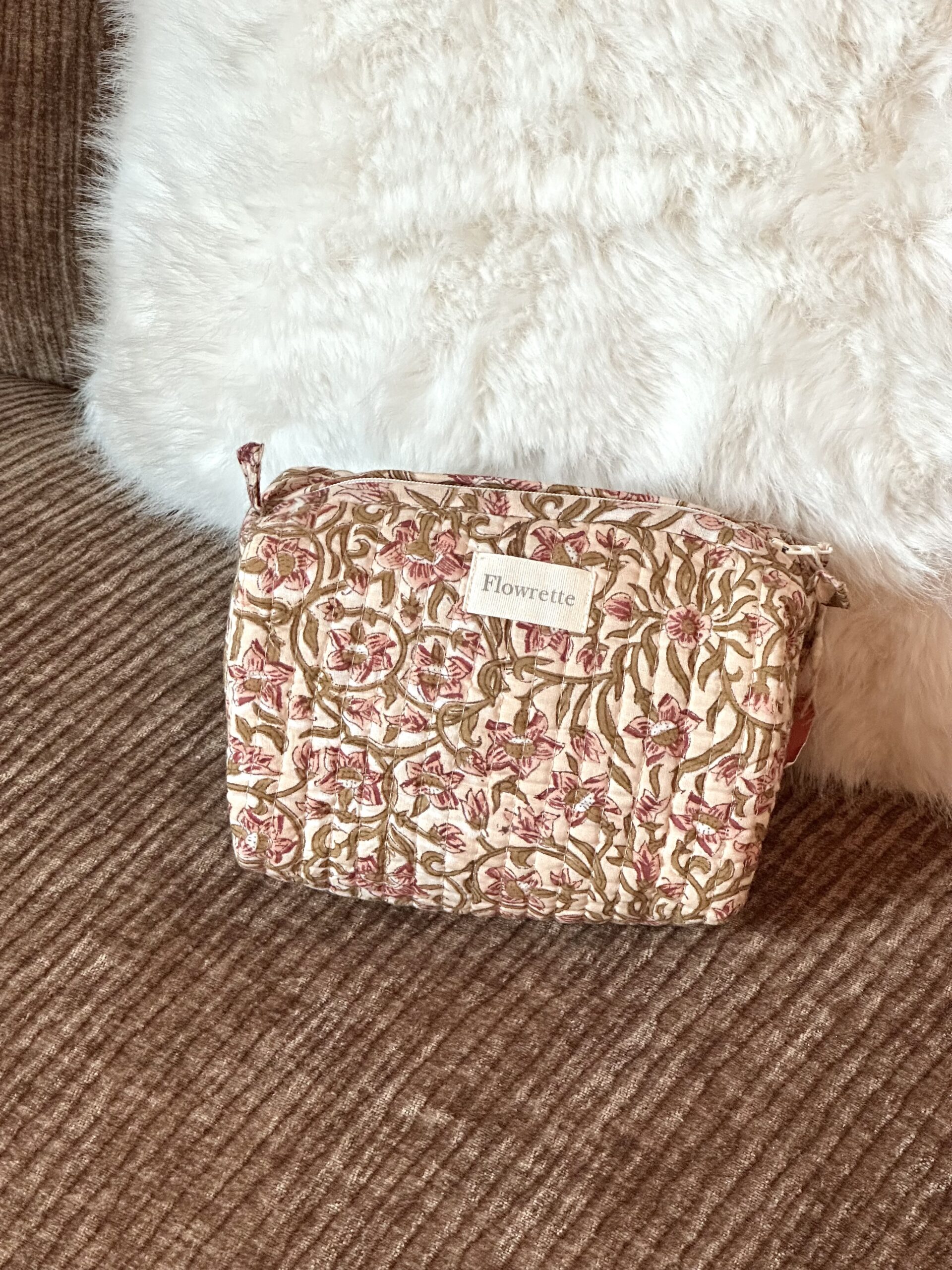 Notez que la couleur peut déteindre du fait de l’application des motifs au block print. Il est fortement recommandé de faire un premier lavage de la trousse seule à 30° en machine.